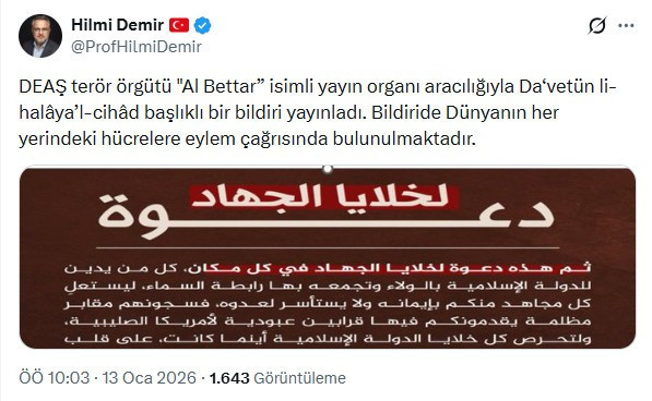 İlgili çağrıyı toplumsal medyadan paylaşan Prof. Dr. Hilmi Demir, “DEAŞ terör örgütü “Al Bettar” isimli yayın organı aracılığıyla Da‘vetün li-halâya’l-cihâd başlıklı bir bildiri yayınladı. Bildiride Dünyanın her yerindeki hücrelere aksiyon davetinde bulunulmaktadır.” tabirlerini kullandı.