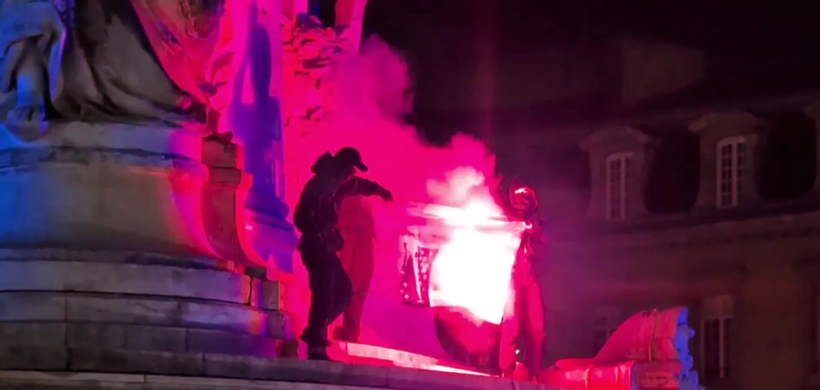 Sivili toplum örgütleri ve siyasi partilerin daveti ile Paris’teki Cumhuriyet Meydanı’nda toplanan yüzlerce kişi, sloganlar eşliğinde ABD bayrağı yaktı.