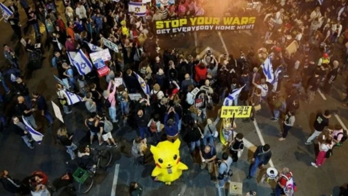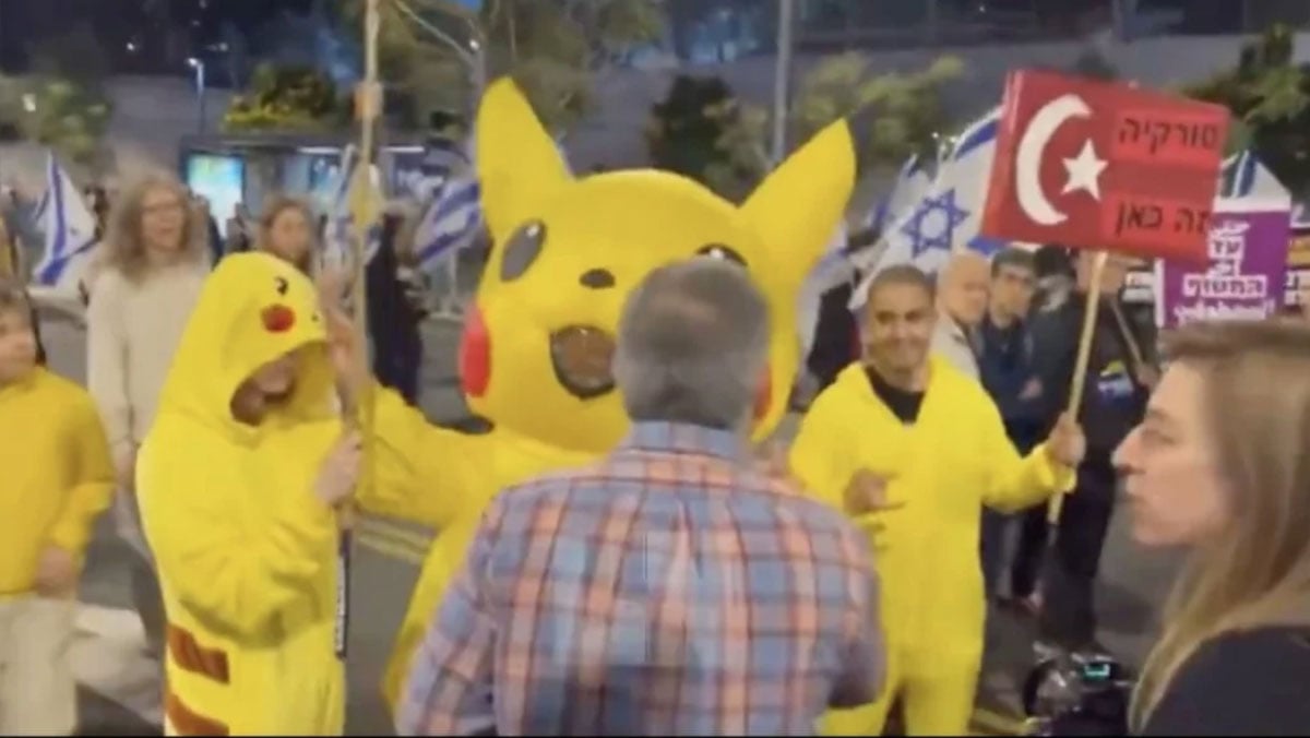 Başkent Tel Aviv’de Begin Caddesi, Habima Meydanı’nda on binlerce protestocu meydan ve sokakları doldurdu. Protestocular ortasında, İstanbul’da Ekrem İmamoğlu için düzenlenen protesto şovlarında görülen ve dünya genelinde toplumsal medyada viral olan Pikachu kostümünü giyen biri de vardı. Kelam konusu kişinin yanında da Türk bayrağı taşıyan birinin olması dikkat çekti.